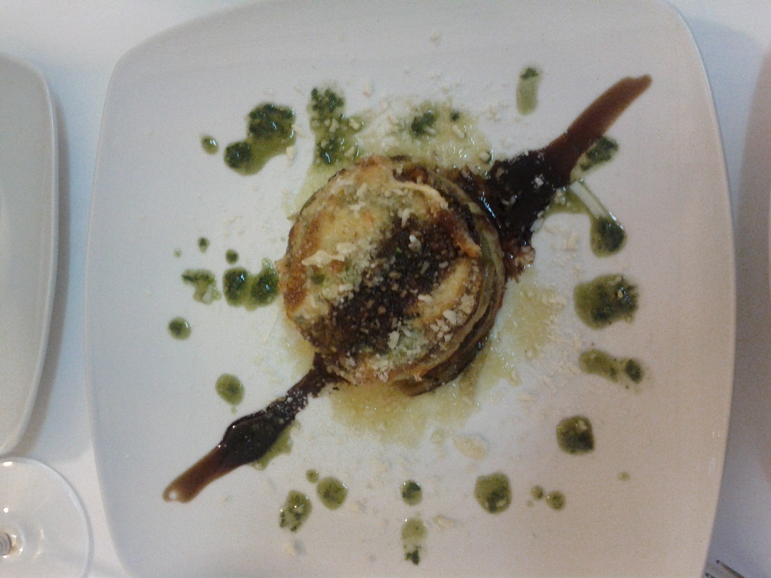 …pretty darn good. The photo with the green dots decorating the plate is eggplant bruchetta.By the way the service and the food presentation is what you would expect from a three-dollar-sign restaurant. The eggplant was tender and infused with the flavor of the sauce. Dana was not shy in mopping up all of the plate decoration with the tiny pizza of salt and garlic that came on the side. Wonderful.