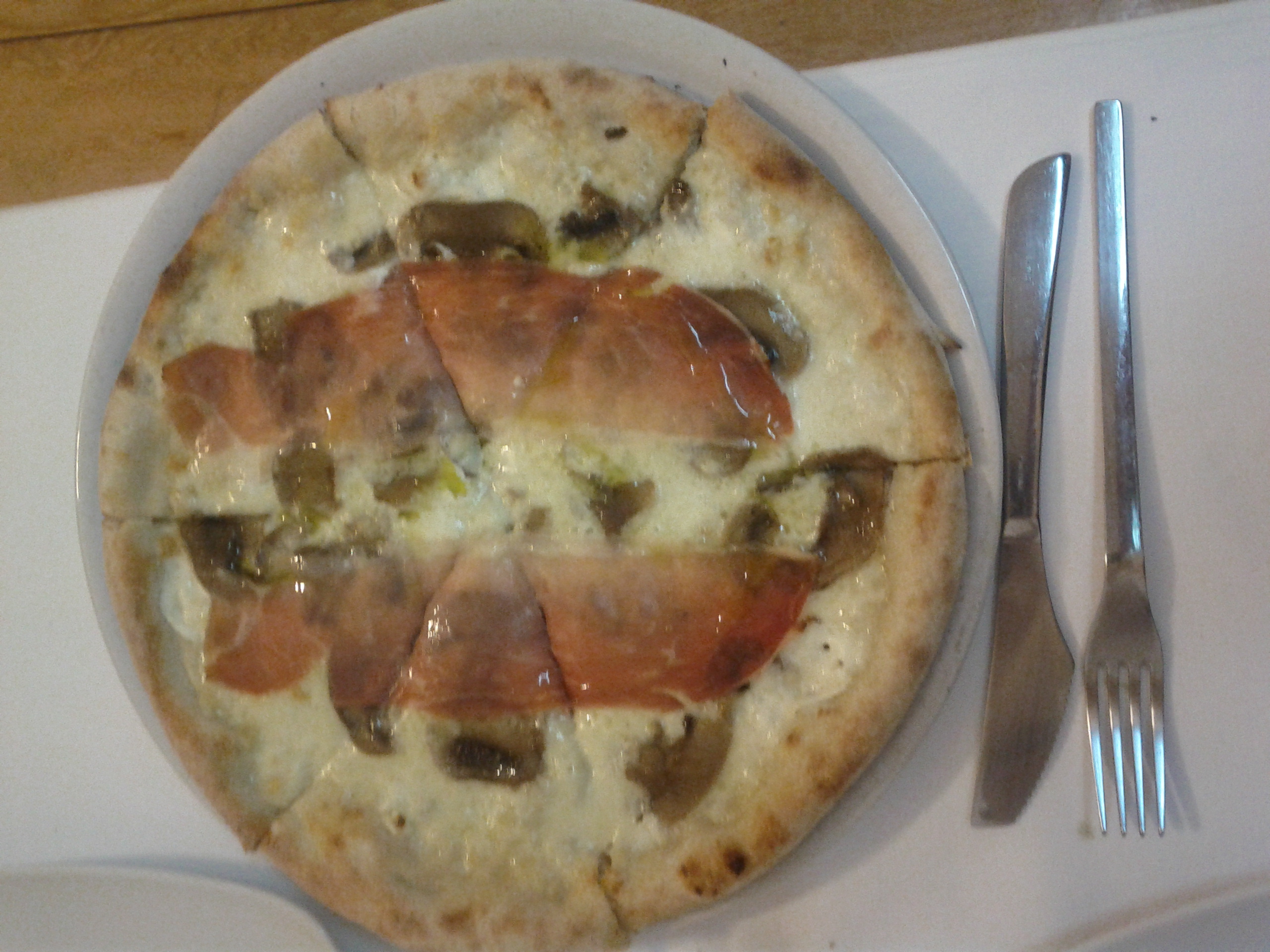 Our main course was a brandy and pears pizza with prosciutto. Yum.