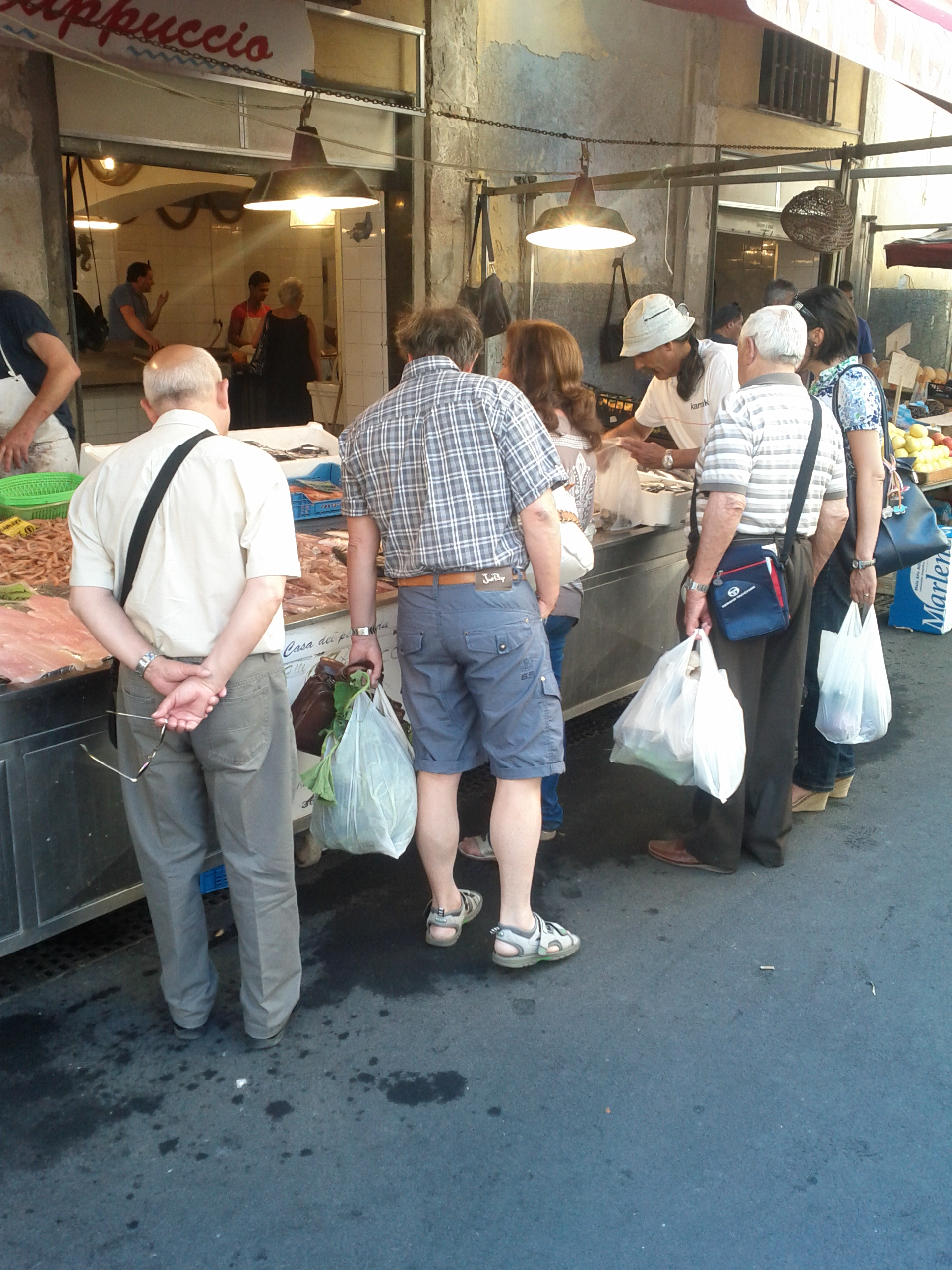 Women here wear scarves here too. I have two and, until it got hot, I wore them a lot. Women’s shoes are unbelievable. Lots of platforms and strappy little leather things. This is not about being comfortable.But I must say they do look feminine. In general the quality is much higher than middle market American shoes. I have yet to see a Sicilian woman or girl in shorts of any kind. They wear skin tight jeans with sparkly tops or sundresses. The younger women wear mini skirts. All of the women wear tank tops. One of the ways you can tell a tourist is big sneakers (especially white), shorts or three-quarter length cargo pants.