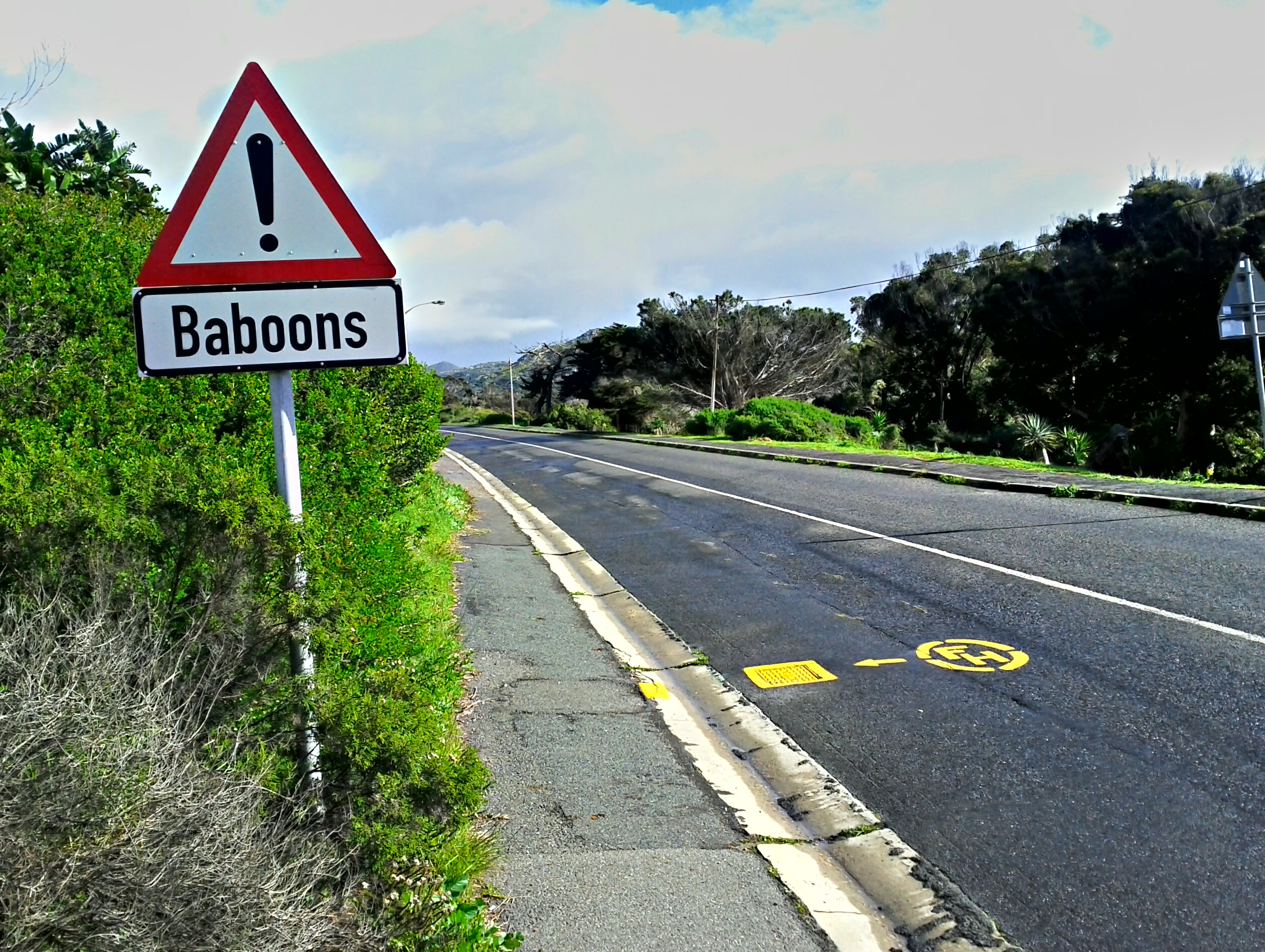 There are baboon stories every where. People tell other people about the latest home invasion.  The little local newspaper had a list of what not to do if you confront a baboon.  This includes no eye contact, do not chase them, do not try to wrestle food or a purse away from them, when you see them in the road lock your doors and windows.  This last one is a bit dated as baboons have learned how to open car doors. If a window is open, they reach in to grab whatever they can, food, a purse, a backpack. Parents of small children must be especially vigilant as these primates will jump on a child and may bite. Dogs and cats are also susceptable to baboon aggression.