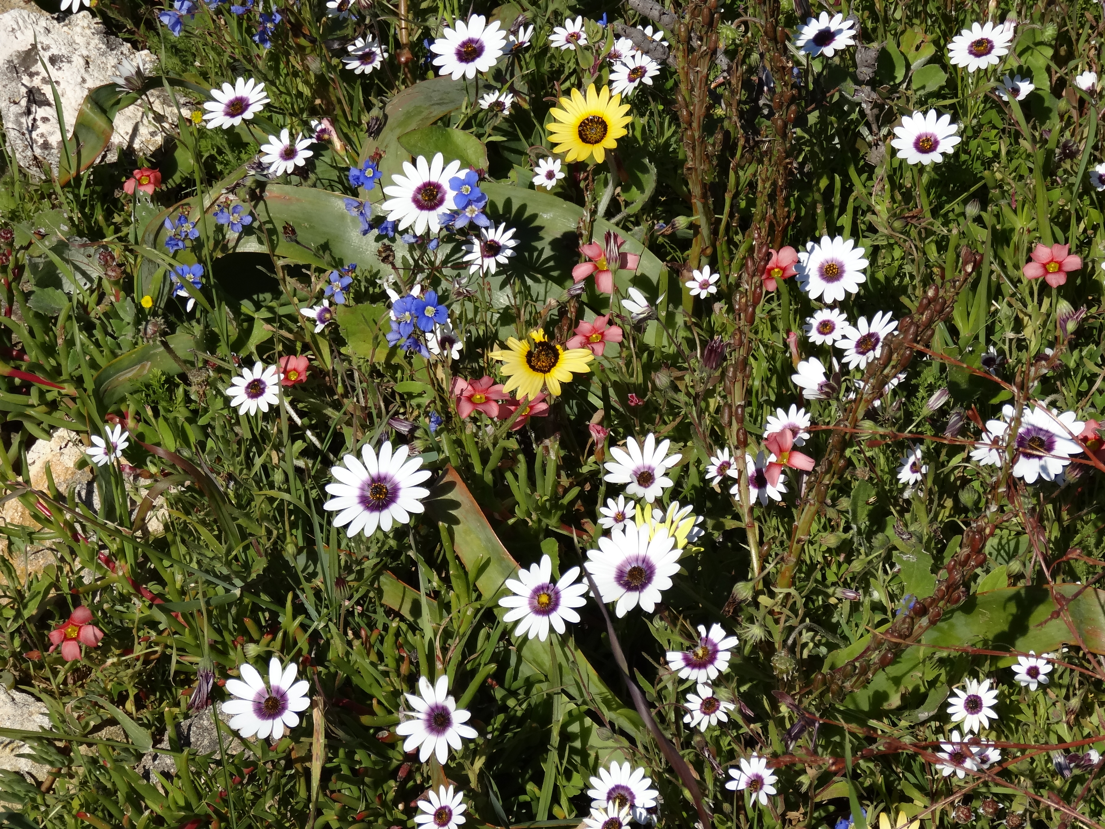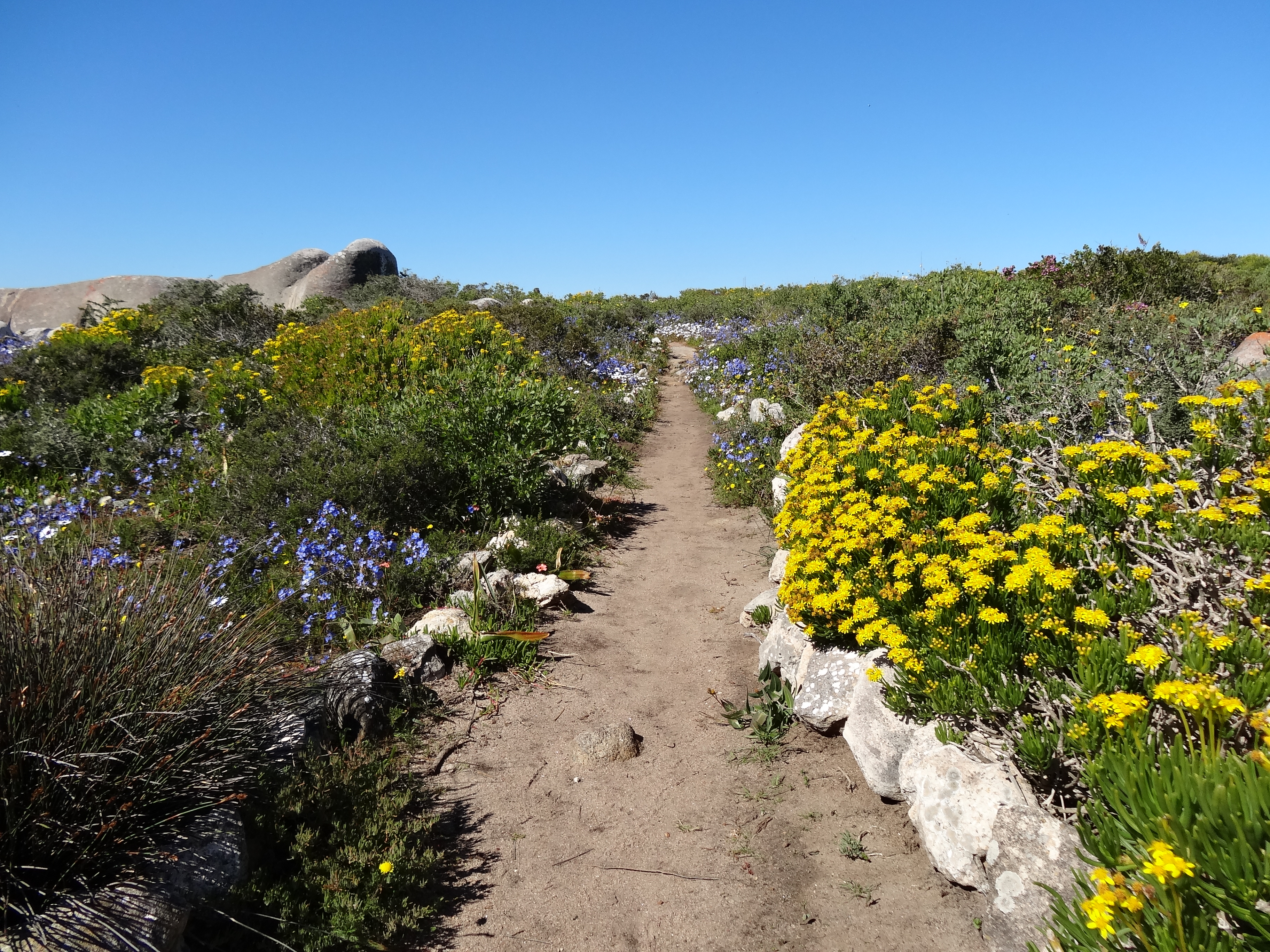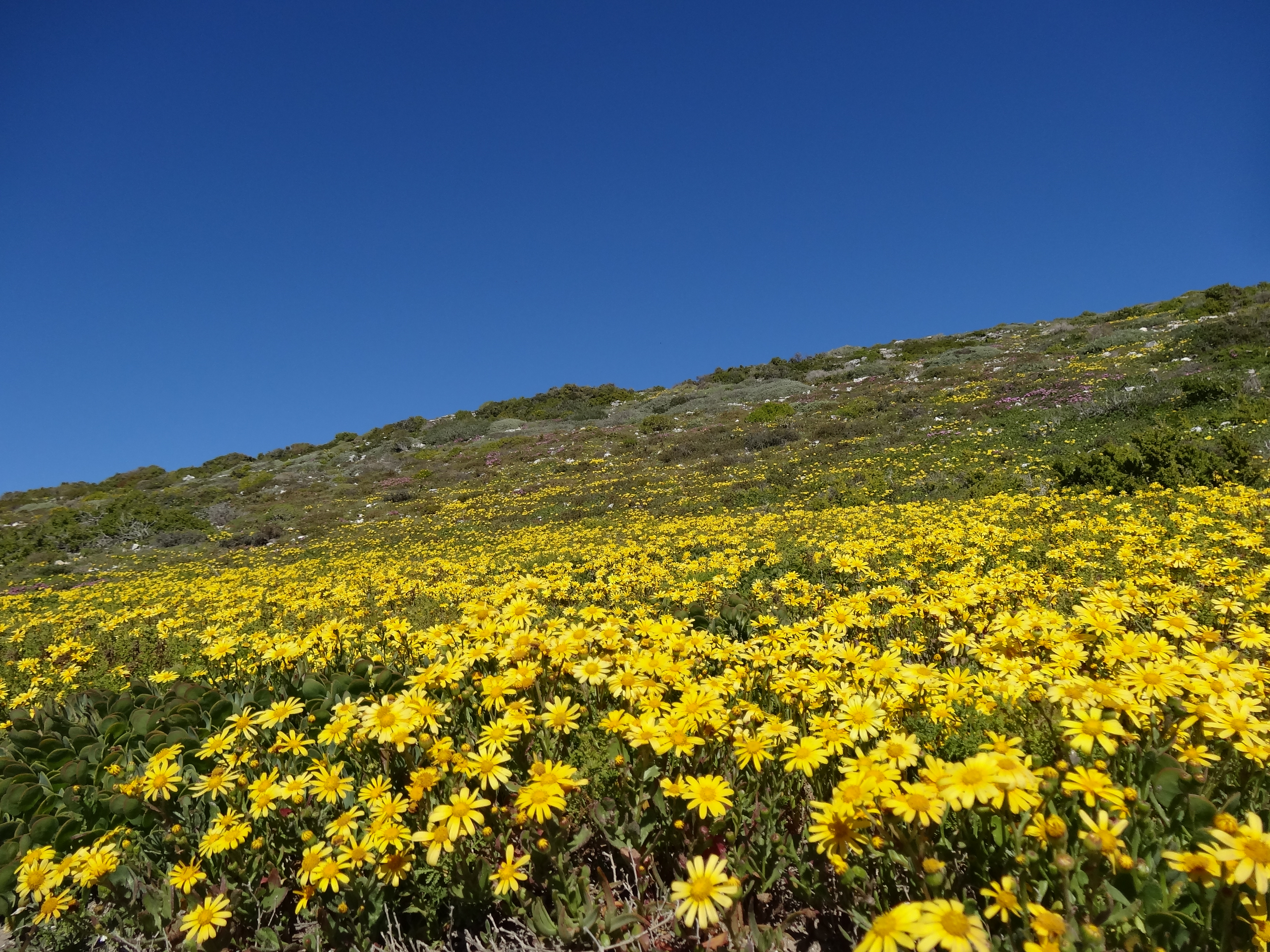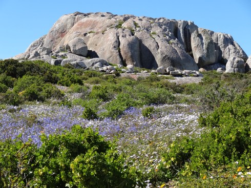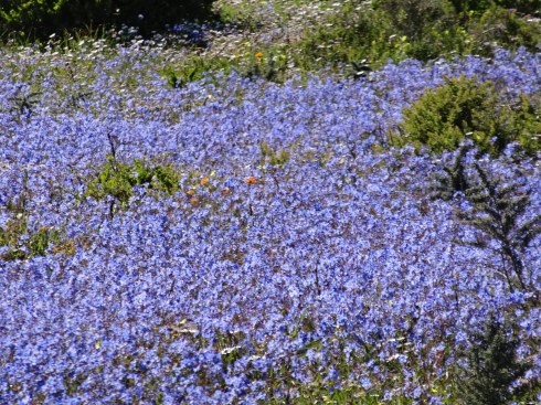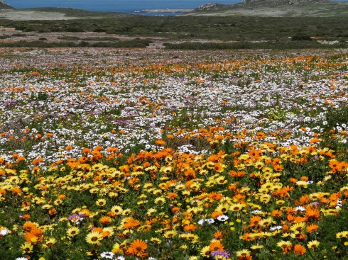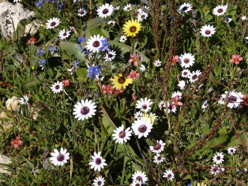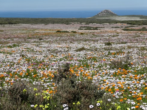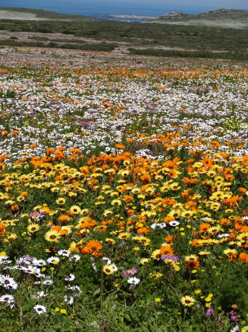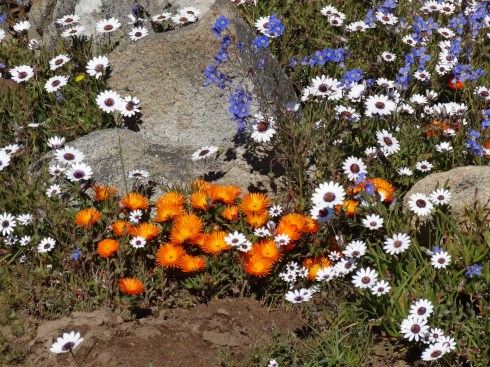 Hi Ursula, Some of these flowers reminded me of California wildflowers but there are none of the ubiquitous poppies of CA in the mix. Yes the fields of white (which doesn’t show really well in the panoramic photo at the top of the page) are Africa daisies with dark purple centers, gorgeous. The bright orange is ice plant and an orange daisy with a yellow center. What is incredible is the combinations of flowers when you look really closely…a kaleidoscope of color. In California it is in Spring that you see the wildflowers as they are here due to a combination of rainfall and sunlight. After spring it is too hot and dry for this kind of bloom. J