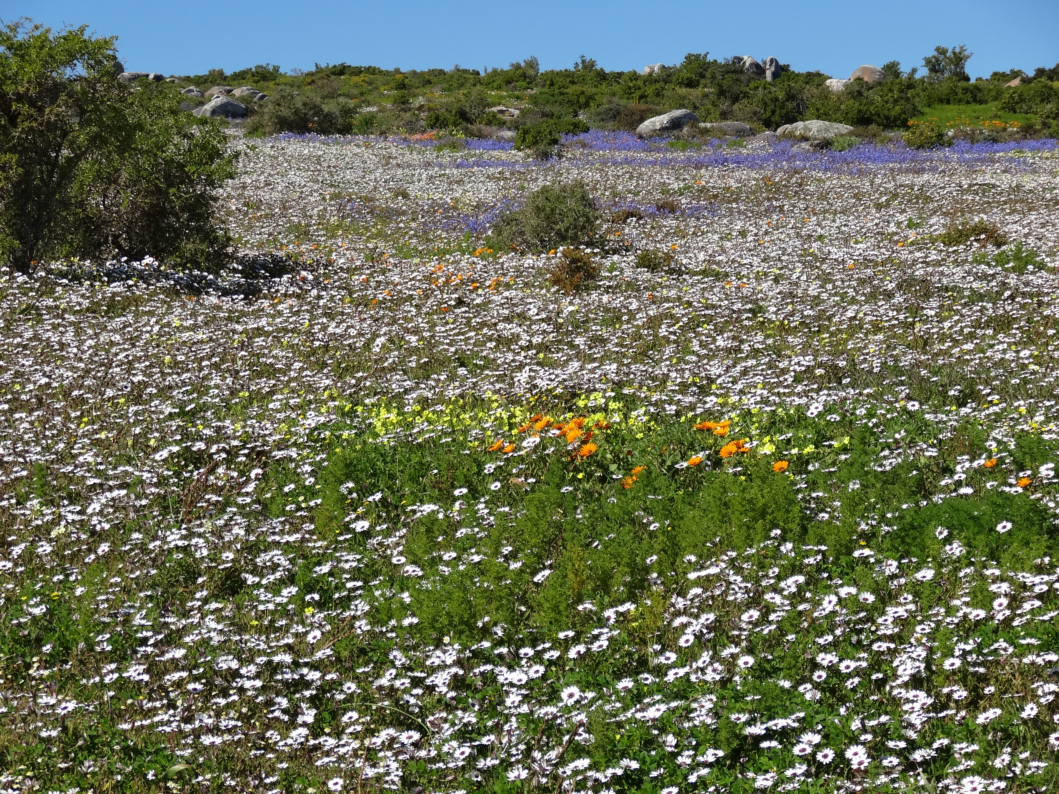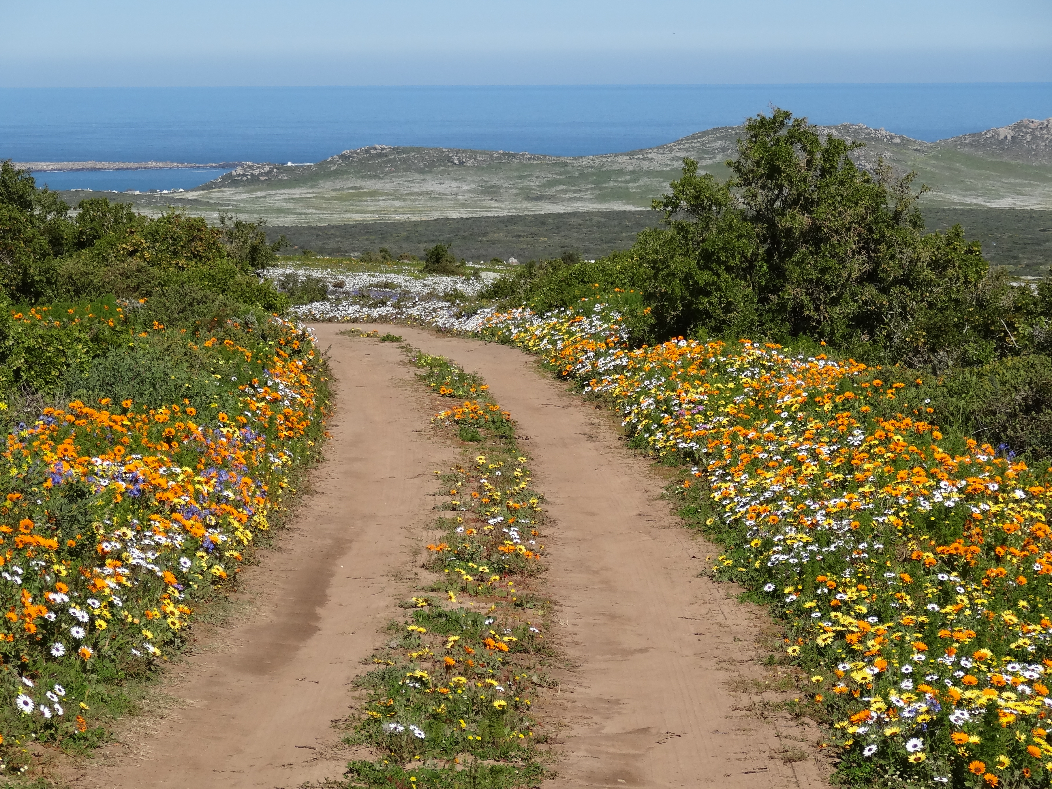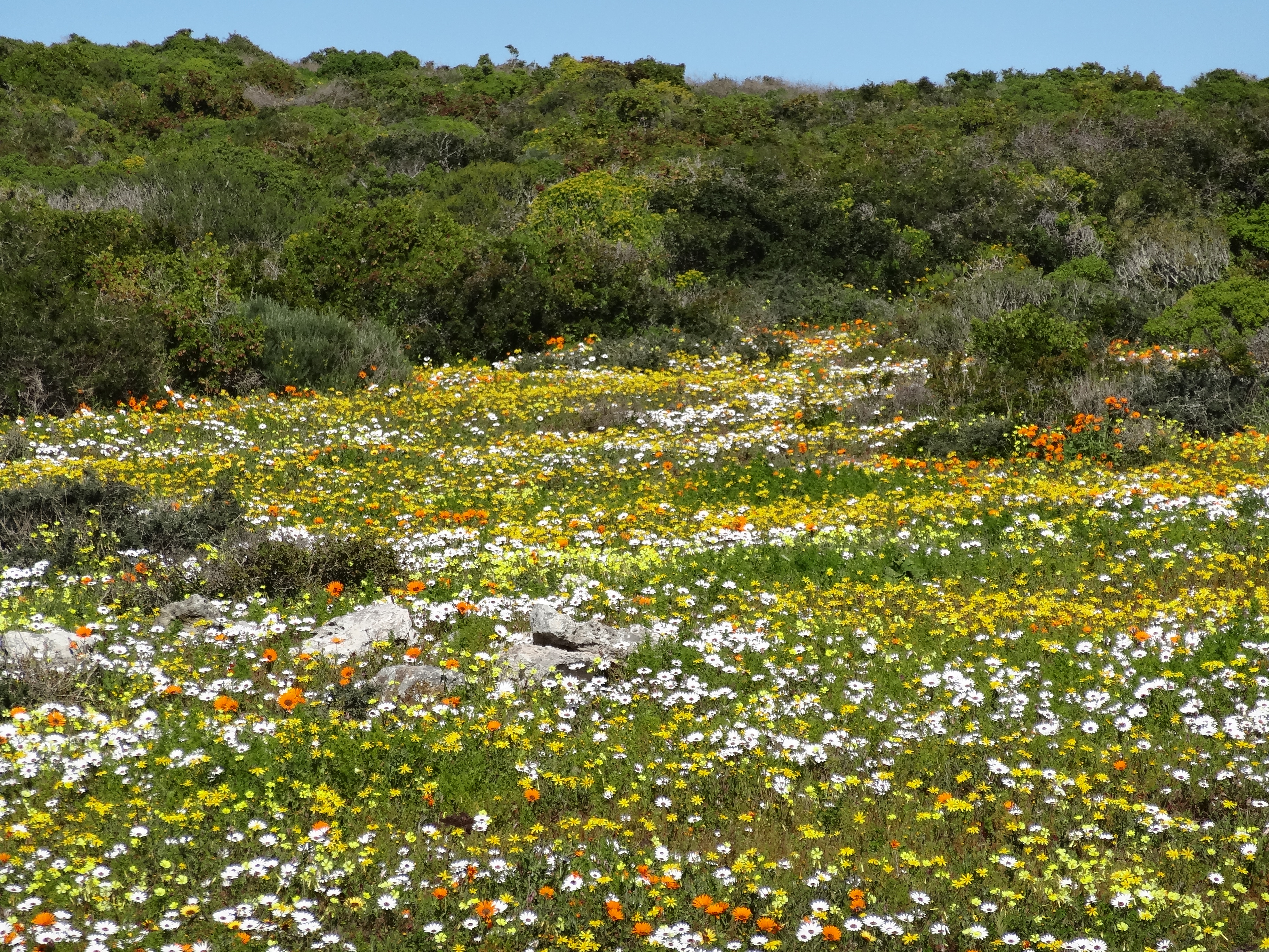 Hi Ursula, Some of these flowers reminded me of California wildflowers but there are none of the ubiquitous poppies of CA in the mix. Yes the fields of white (which doesn’t show really well in the panoramic photo at the top of the page) are Africa daisies with dark purple centers, gorgeous. The bright orange is ice plant and an orange daisy with a yellow center. What is incredible is the combinations of flowers when you look really closely…a kaleidoscope of color. In California it is in Spring that you see the wildflowers as they are here due to a combination of rainfall and sunlight. After spring it is too hot and dry for this kind of bloom. J