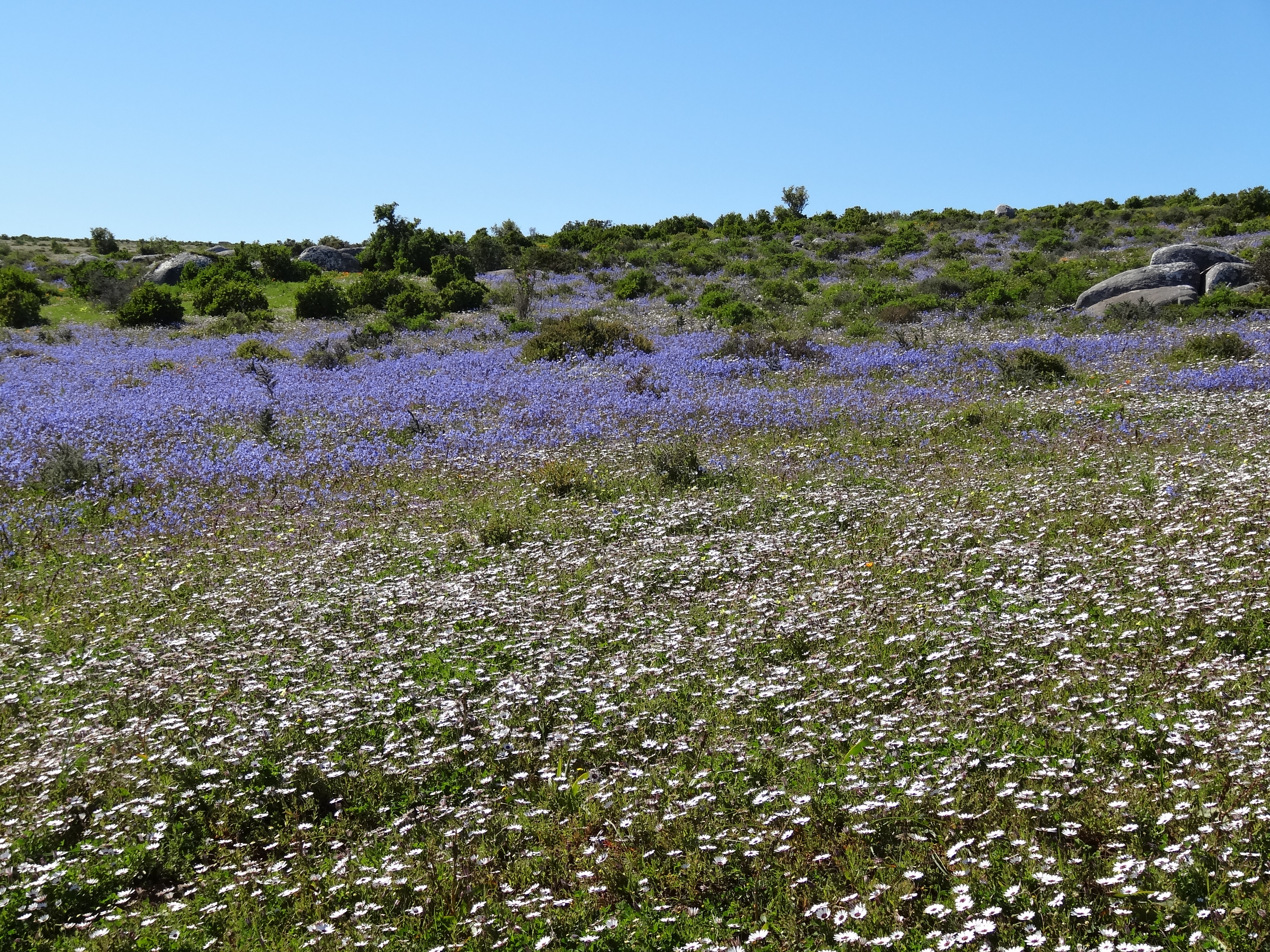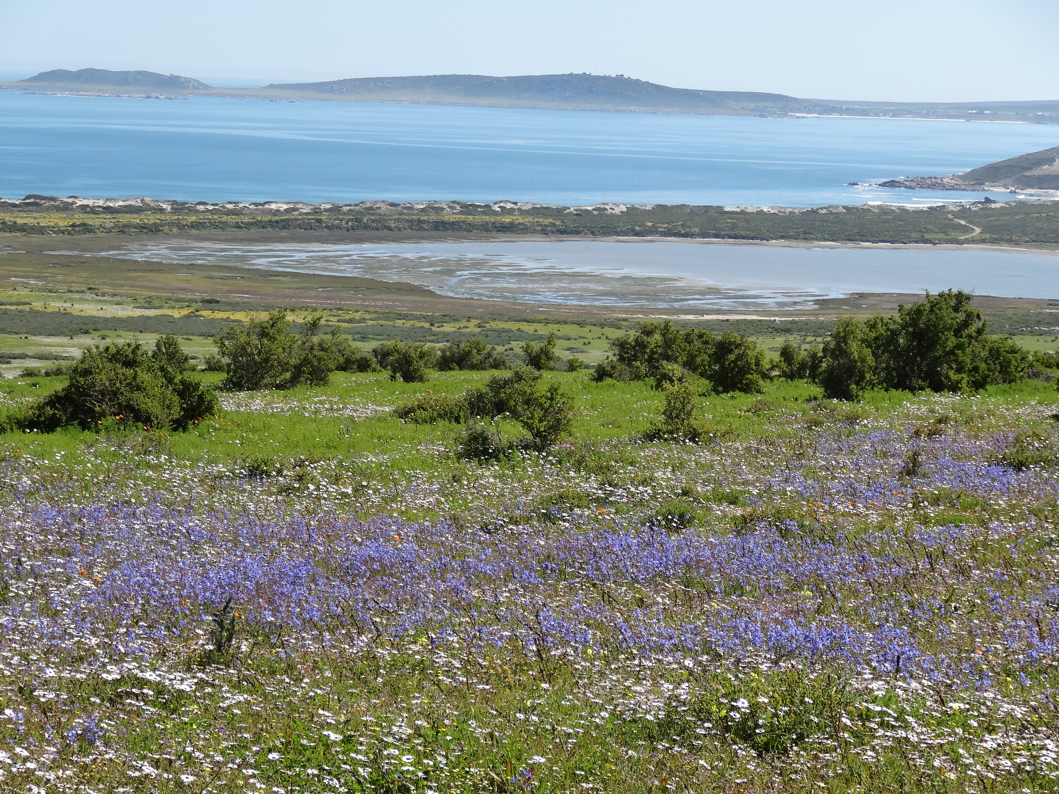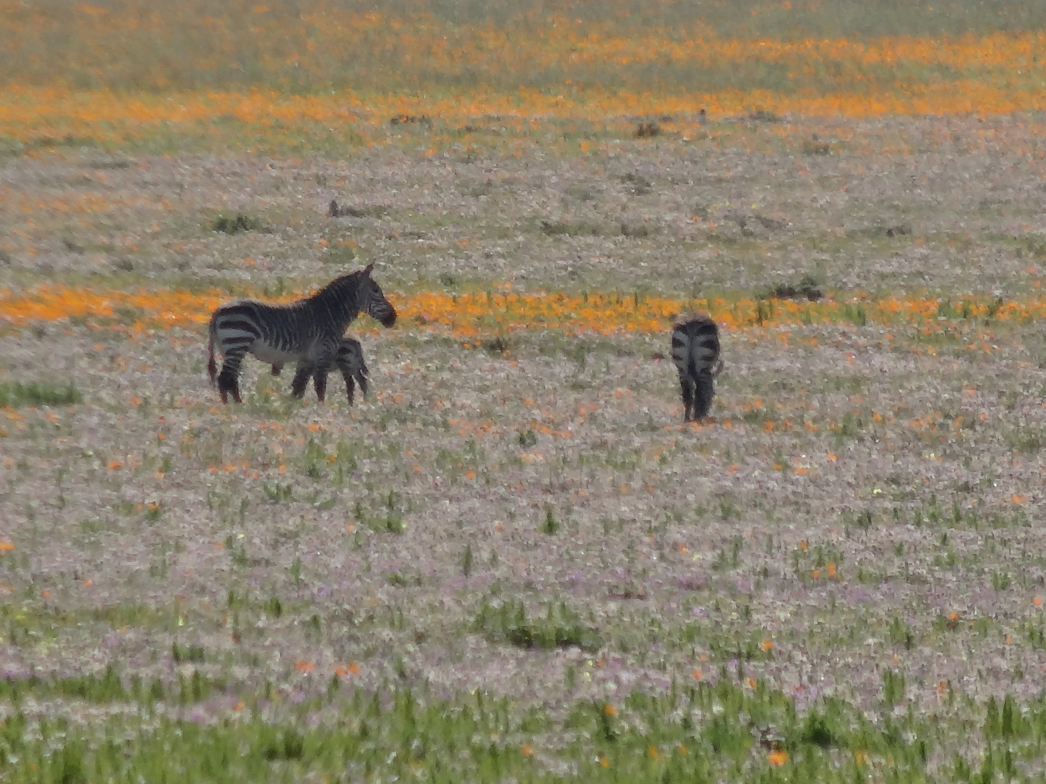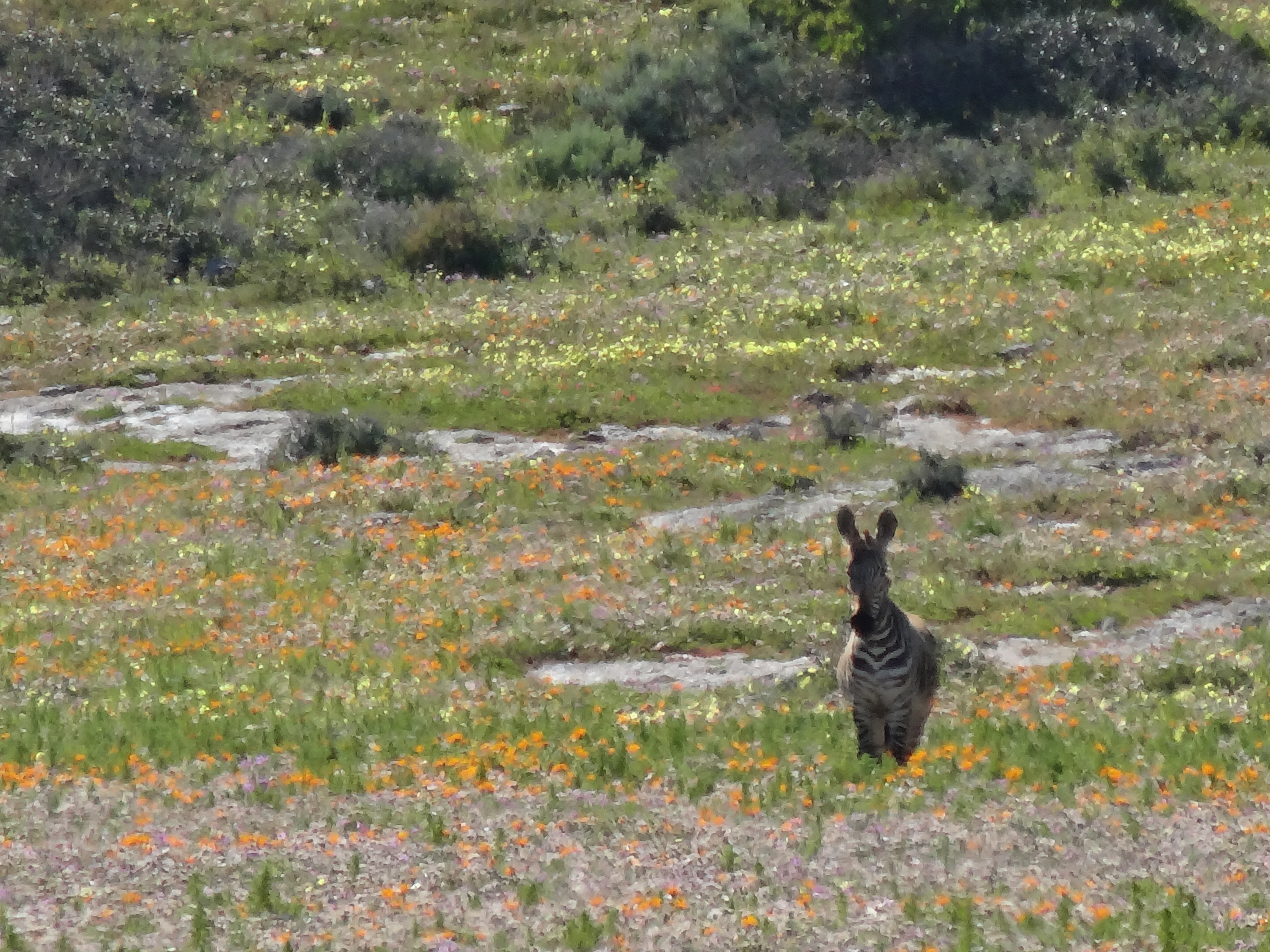 Hi Ursula, Some of these flowers reminded me of California wildflowers but there are none of the ubiquitous poppies of CA in the mix. Yes the fields of white (which doesn’t show really well in the panoramic photo at the top of the page) are Africa daisies with dark purple centers, gorgeous. The bright orange is ice plant and an orange daisy with a yellow center. What is incredible is the combinations of flowers when you look really closely…a kaleidoscope of color. In California it is in Spring that you see the wildflowers as they are here due to a combination of rainfall and sunlight. After spring it is too hot and dry for this kind of bloom. J