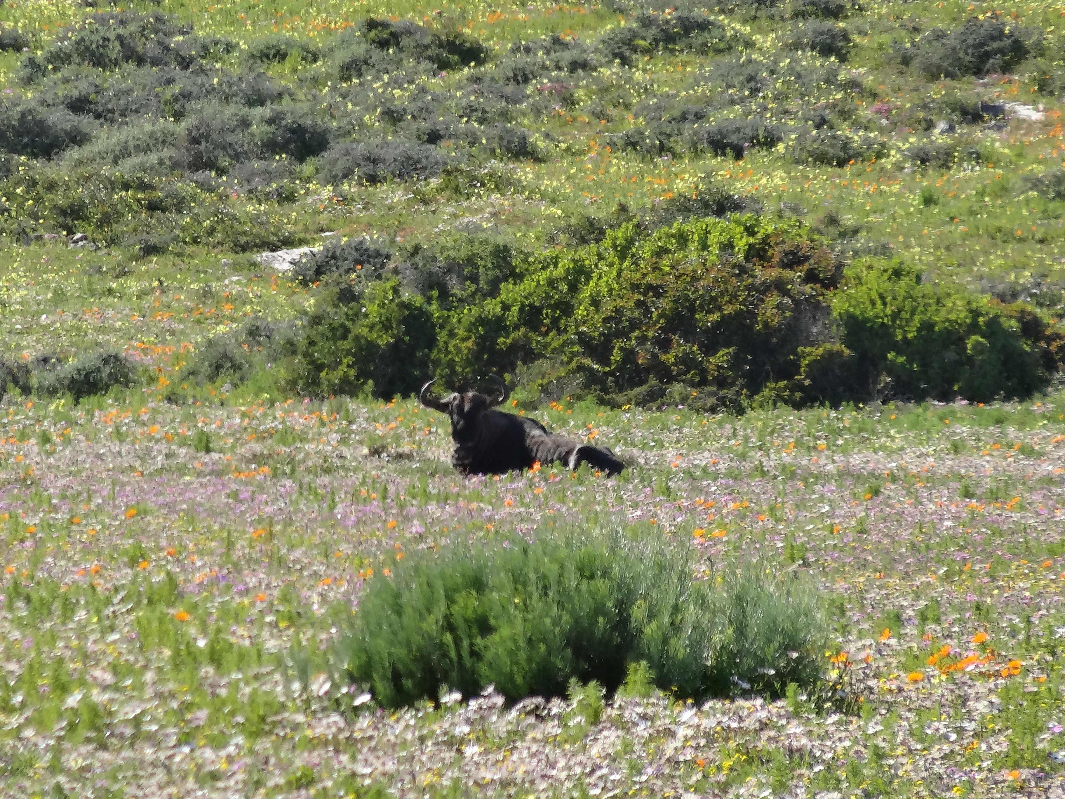 There is wild life among the  flowers. Two Cape Buffalo came thundering down the road toward us and veered from us just in time.