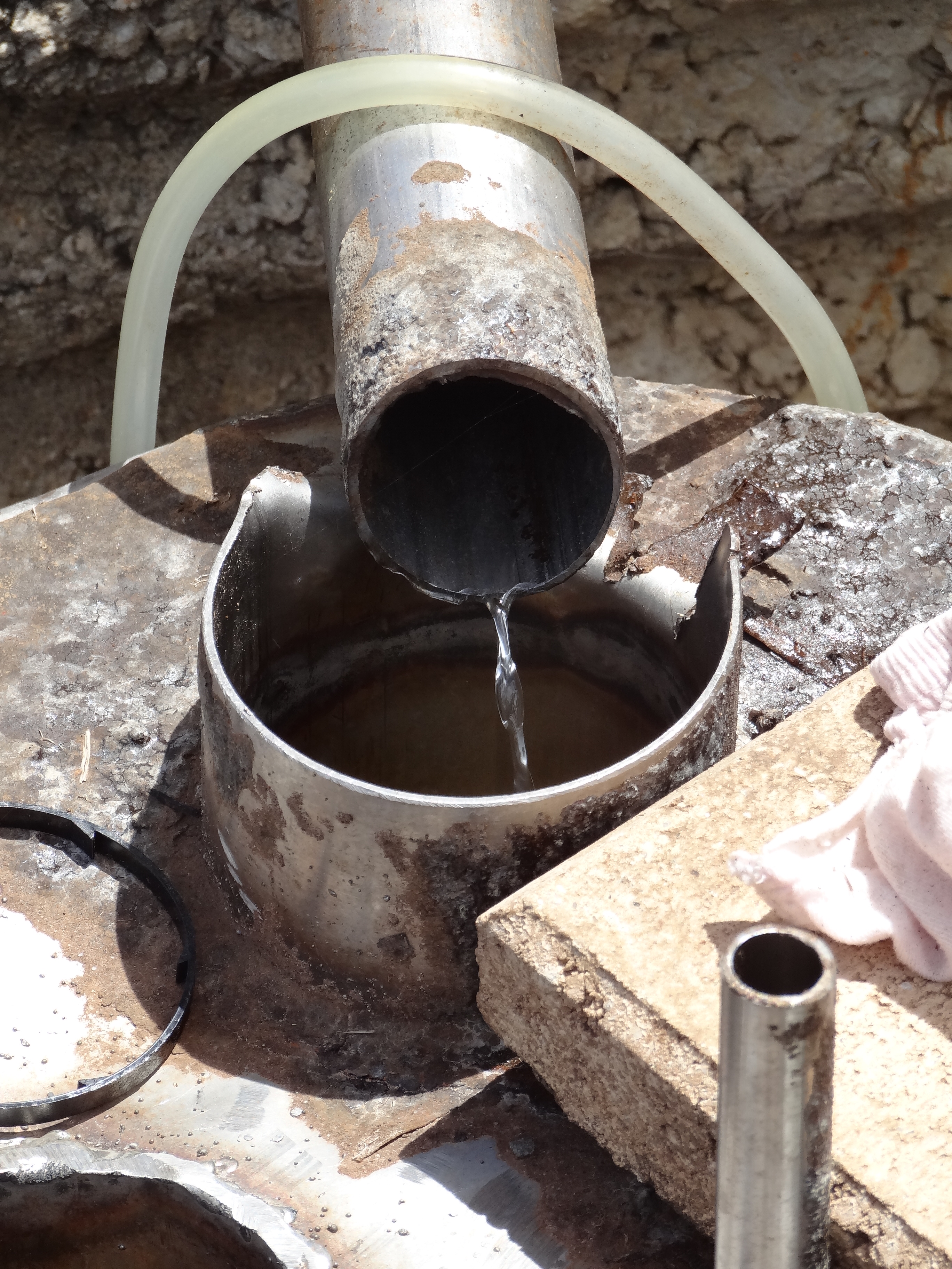 One half ton of leaves are distilled in each batch. In the winter this yields about two liters of oil and in the summer, 10 liters.