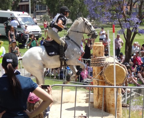 It is a sunny, 75 degree day as we seek out a good vantage point for the races. Jumps are set up in Adelaide’s Rundle and Victoria Parks in the parklands surrounding the city. Jumps include a small canal (about 3 feet across) that bisects the parkland. Many jumps are six feet tall built of wood and topped by thatch. The width of the jumps vary from a log’s width to 6 to 7 feet.