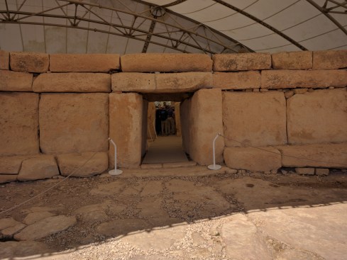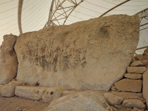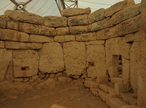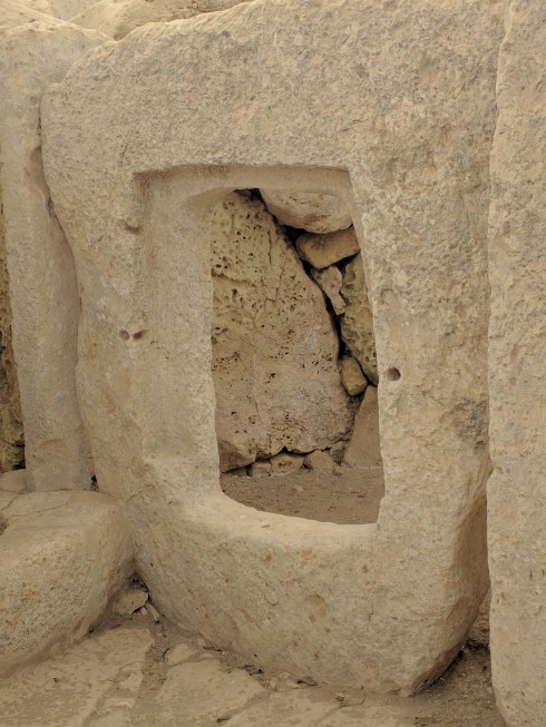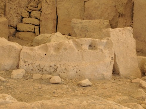 On either side of the court is an opening cut from a single megalith known as a “porthole” doorway. The two doorways give access to circular rooms behind the courtyard. The facing doorways are positioned so that it is not possible to see into one internal room from the other. As in the Tarxien temples holes were made in the stones to attach doors or screens that may have been used for privacy or to shield rituals.
