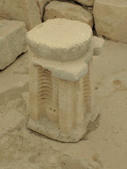 Later temples have external walls of Coralline limestone which is harder than the Globigerina used for the interiors, reliefs, carvings and sculpture. The carving above shows the use of this soft limestone in one of two identical altar pieces found during excavation of the site.