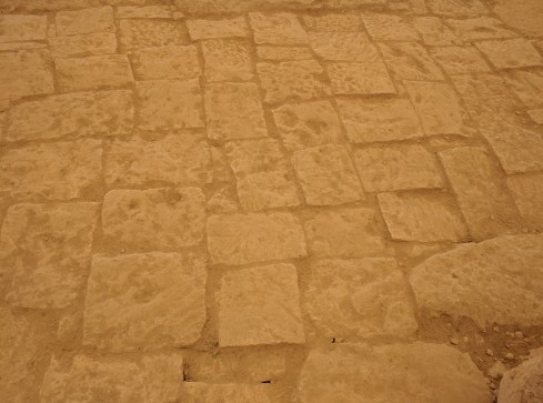 The floor of the court is created with gigantic flagstones. The millenia have done little to disturb the flush surface of the carefully trimmed and placed limestone rocks. All of the prehistoric buildings at Hagar Qim, built around 5,000 years ago, are Globigerina limestone, a relatively soft yellowish stone that is still used for buildings in Malta.