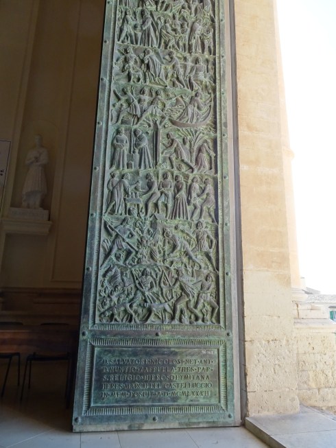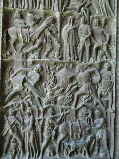 As we exited the church we moved from the darkness toward the light thrown by the massive open doorway. And there in the sunlight were the most extraordinary bronze doors sculpted with scenes from the Bible.