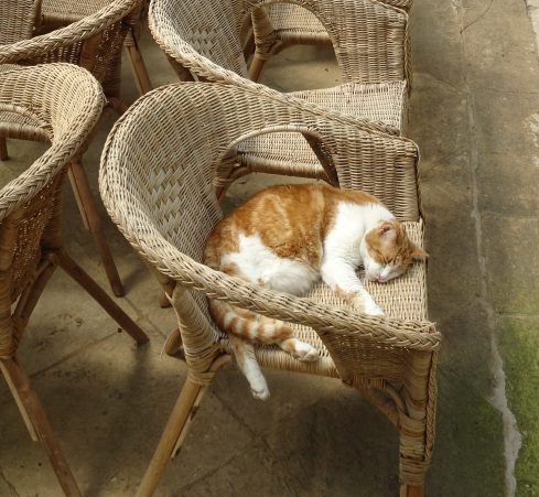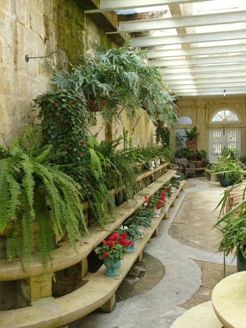 There is a Conservatory in the garden filled with palms and sculpture. Also a resident cat taking an afternoon nap in the warm sun. Even Malteze cats take naps from 1 to 3. Can you find the kitty in the photo?