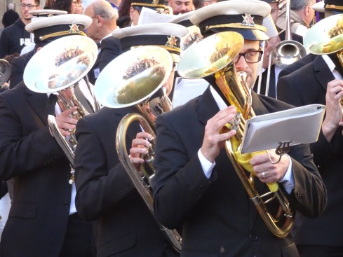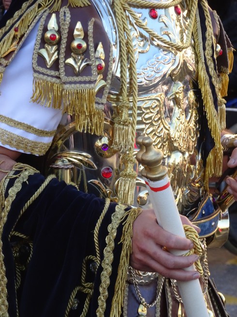 In the procession the events and people leading up to the crucifixion are portrayed. Jesus, Moses, John the Baptist, Judas, the Pharisees, the Roman soldiers, Pontius Pilate, Herod, the thieves, Mary and Anne as well as penitents and all of the local people who are there to support the church. There are two bands playing dirges that set a tone of sadness.