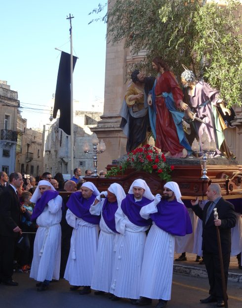 Naxxar is known for its traditional procession, a silent Passion Play that moves through the streets of the village on the Friday evening before Easter. On Good Friday the solemn procession tells the story of the crucifixion. The village prepares by draping buildings in black banners. The village is in mourning. The church bells toll with a slow, doleful chime.