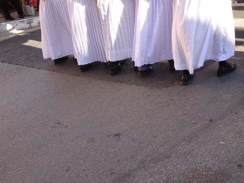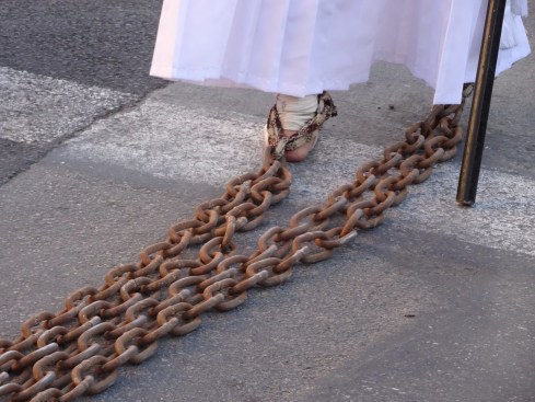 From beginning to end the procession takes over four hours from the first sounds of music until the last person returns to the church.  Some of you may have heard of the tradition of “penitents” in your communities. They are confraternities of Catholic men dedicated to a Brotherhood of Jesus. There are penitents in this procession. Their clothing may surprise you as they dress completely in white with white hoods covering their heads. Several of them walk the four hours with bare feet and very heavy iron chains shackled to their ankles to offer up their suffering in the name of Christ.