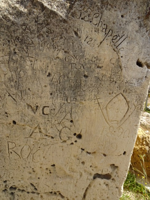In the mid- to late 19th century those of sufficient means took ” The Grand Tour.” The Grand Tour was the traditional trip of Europe undertaken by mainly upper class, well-educated Europeans. It was considered necessary for one to develop the mind and expand knowledge of the world to complete a classical education. No tour was considered complete without the trip to remote Malta to see the Neolithic temples. Chief among these temples were those at Ggantjia. Then it was common for visitors to carve their name and the date of their visit in the soft limestone rock of the temple walls. Those marks are still visible today.