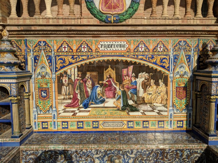Mosaics ring the elaborately paved plaza. Each province has a tiled alcove with a map and a tableau most usually representing an important historical moment in that province.