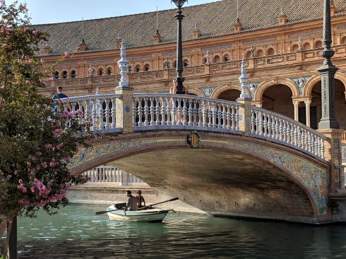 It was really warm (90s) the first two days but it has cooled off to mid to low 80s. Wonderful weather. No rain. The heat doesn’t really matter to the Spanish. Life just gets started here at 9 pm (as you know) and the day has cooled by then. People are out on the Guadalquivir river paddleboarding and rowing as we walk across the bridge to Centro. September is a good time to visit.