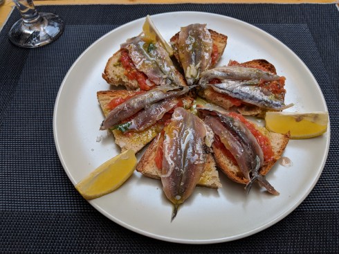 Fresh sardines on crusty toast points is actually a pincho, a tapa variation named by the Basque of northern Spain.