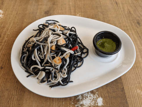 Aromatic squid ink colors this pasta black with sliced squid, pesto and a little red chili pepper