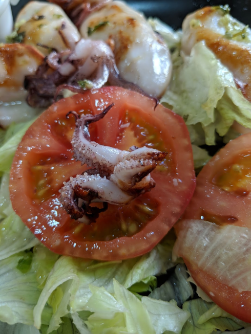 Adorable little squid legs on a bed of fresh lettuce dressed with olive oil