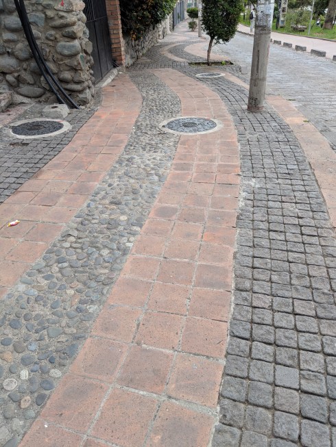 Where most people observe at eye level, Dana is a 360 degree looker. So he was the first to notice the sidewalks of Cuenca. The patterns and designs are unique to neighborhoods, blocks, special landmarks, or sometimes it seems there will be a set placed on a random whim.