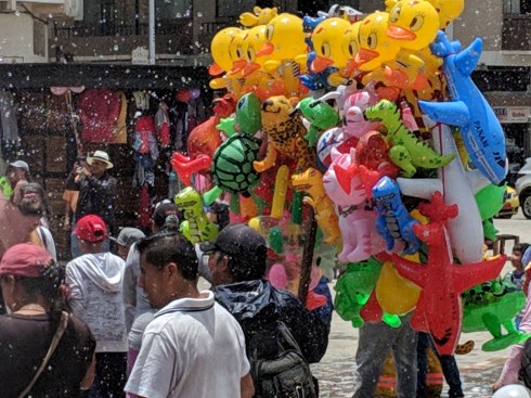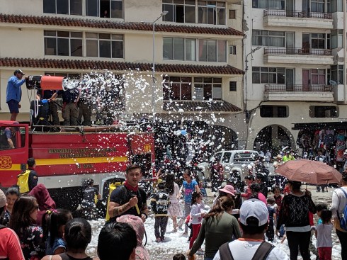 In Cuenca, Fat Tuesday is marked with a special way of celebrating, spray foam. Starting more than two weeks before, store shelves are filled with gaudy aerosol cans of white foam. Schools let out on Thursday with a street party. The kids chase each other with foam cans and super soakers. At the parade foam flies everywhere, aimed mostly at the marchers, especially dancers.