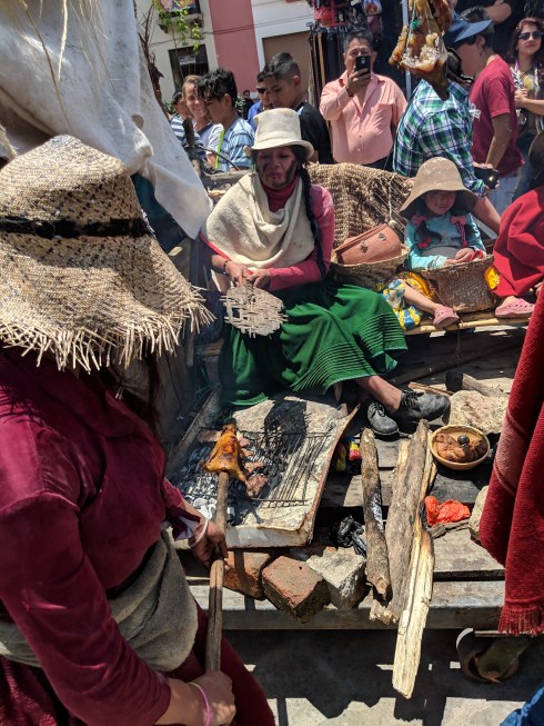 Cuy, guinea pig, is a traditional Andean dish that once was only available to royalty. One parade float featured a native hut complete with an open fire where a cuy roasted. The fire was constantly fanned and the cuy thoroughly cooked by the end of the parade.
