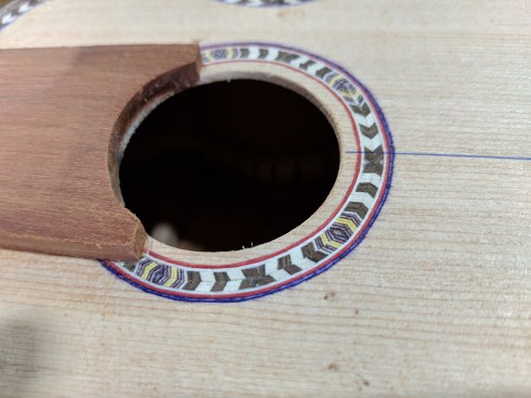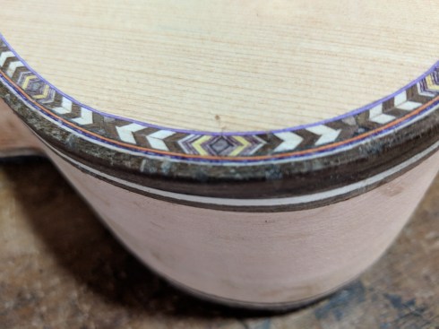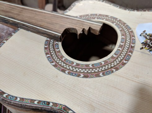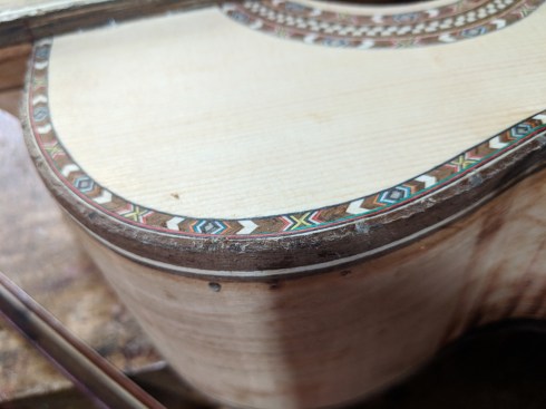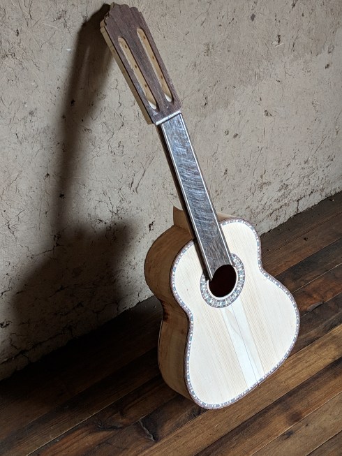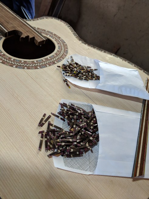 Santiago is known for the incrustation (rosette) inlays for the trim encircling the guitar sound hole. Varied fine woods are lacquered and glued together in long strips, cut into tiny geometrics then placed individually and by hand in painstaking detail. Musicians and collectors from all over the world prize guitars made by the Uyaguaris.
