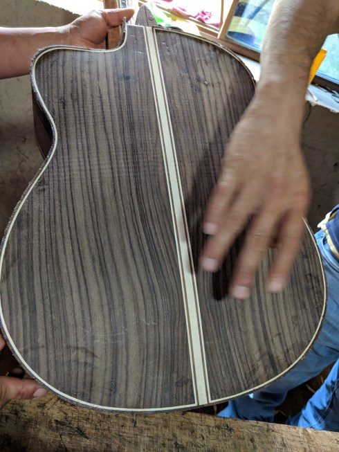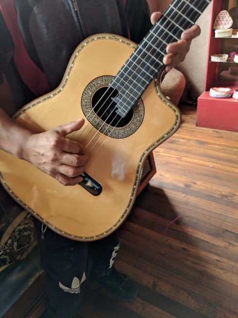 Each guitar is played, tested and adjusted to produce the finest instrument. Santiago played different guitars for us so that we could hear the tones of each.