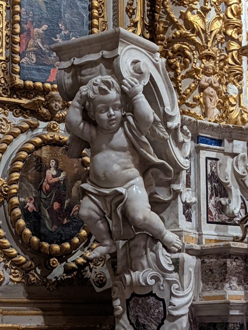 Cartapesta has been called “the poor man’s marble.” Though it may have begun as a substitute for the more expensive carved marble of Northern Italian churches, it has grown into its own art form centered in Lecce. Whether a light as a feather basket of lemons that fits in the palm of your hand, a larger than life-size statue of the crucifixion or the curls and swirls, catouches and swags of a Baroque church interior, cartapesta is its own original art tradition.