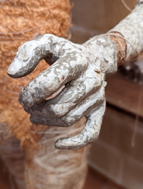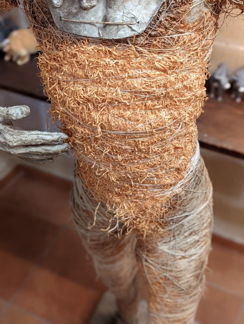 Claudio Riso creates the underlying wire structure and builds that out with curly straw. He covers the straw with papier mache then adds hands and feet of terracotta.