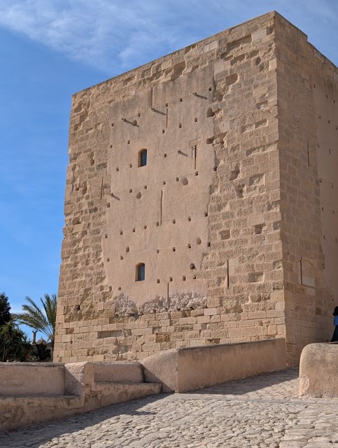 Santa Barbara Castle dominates the landscape, the history and the culture of Alicante. You can see it in full view or in glimpses from all parts of the city. From the top of the castle walls you can see the entire city all the way to the circling mountain ranges. The harbor to the bullring is all visible from the top of the Castle. And the view continues down the winding stone road that descends 160 meters, from the top of Mount Benacantil to sea level.