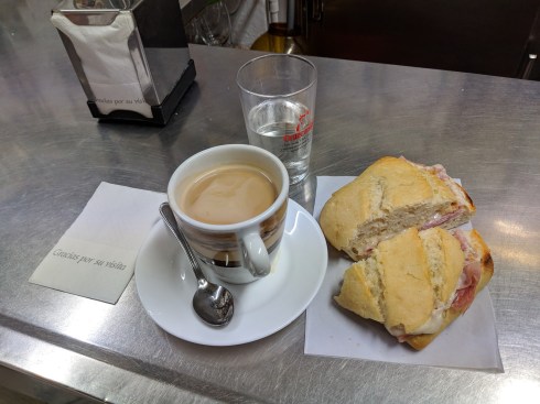 One by one a single toaster oven produced all of the fresh tostadas, a breakfast sandwich of Iberian ham and local cheese on a soft roll. The cafe con leche was dark, bitter and, uncharacteristically ample.
