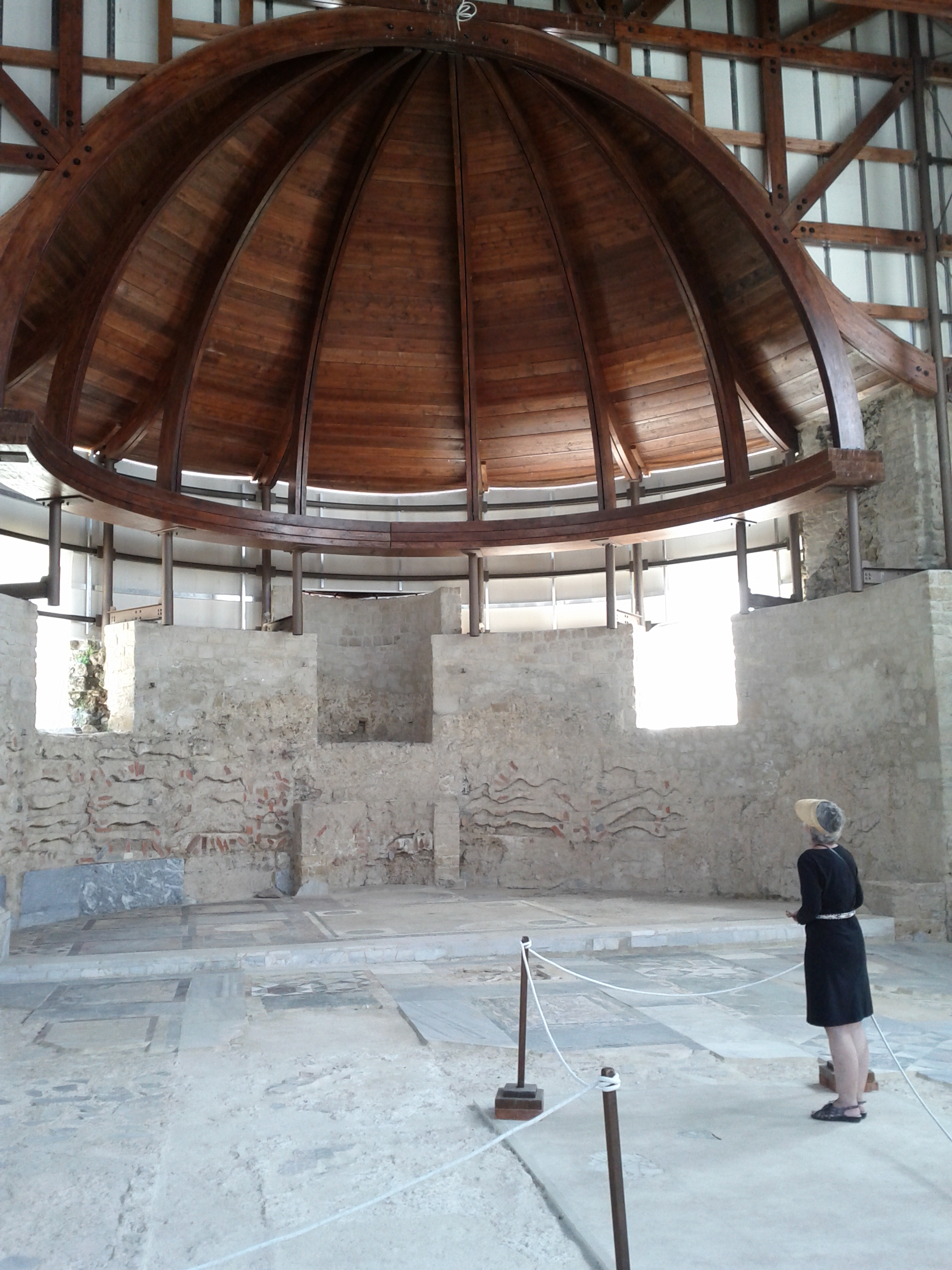 This basilica is being reconstructed in a Roman villa near Piazza Armerina. The home includes custom mosaic floors, frescoed walls, an indoor swimming pool and aqueducts. The villa was built in the first quarter of the fourth century for an upper class Roman.